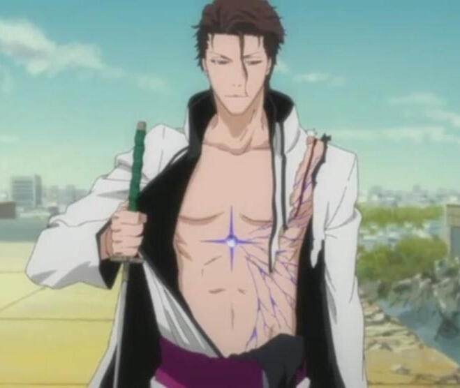 Usual Clothing Style: Aizen wears full clothing similar in style to the Arrancar, complete with a pink sash around the waist.
